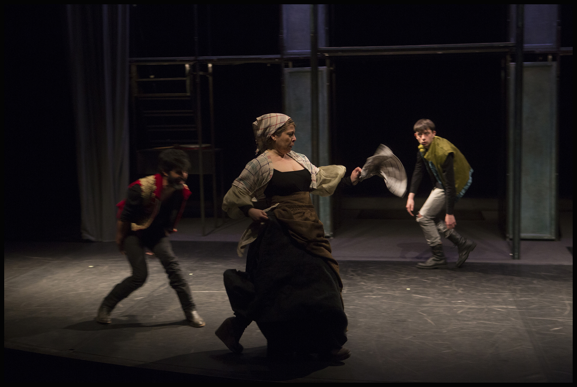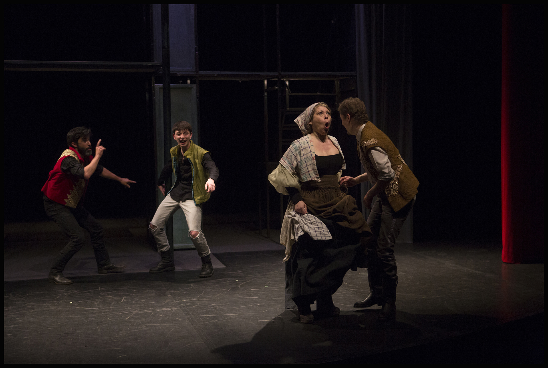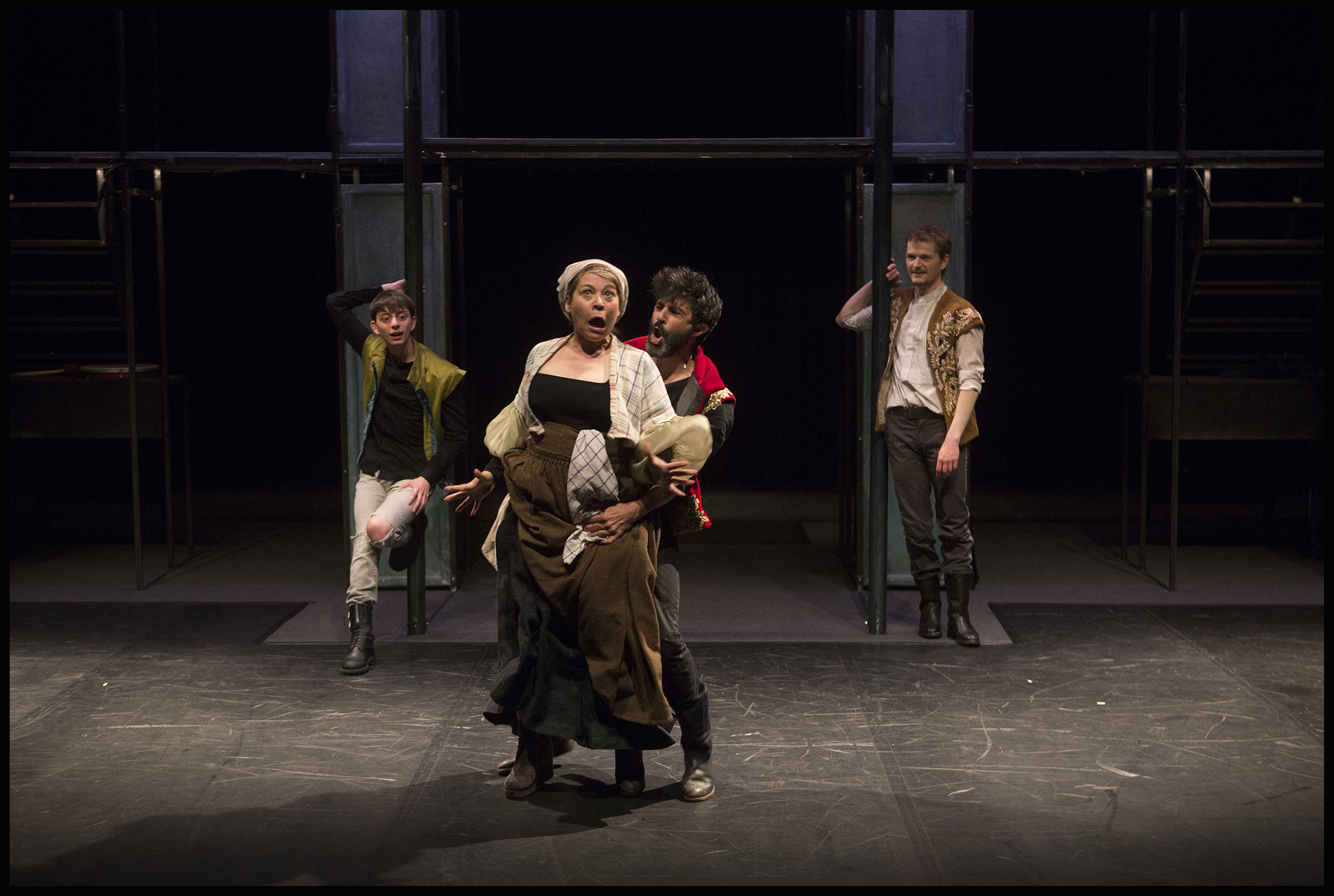 Une mise en scène qui joue sur la verticalité. Un dispositif scénique permettant de retrouver l'atmosphère du théâtre Elisabéthain dans nimporte quelle salle de spectacle. Un astucieuxsystème d'éclairage intégré au décor, qui assure une quasi autonomie au spectacle, et permet son adaptabilité dans presque tous types de lieux, à condtions de disposer d'une certaine hauteur.