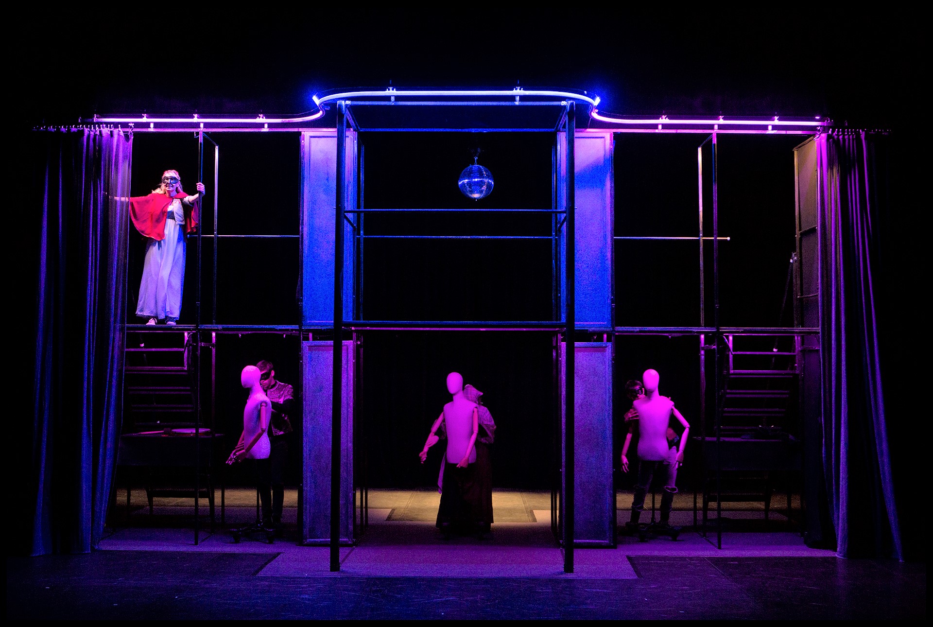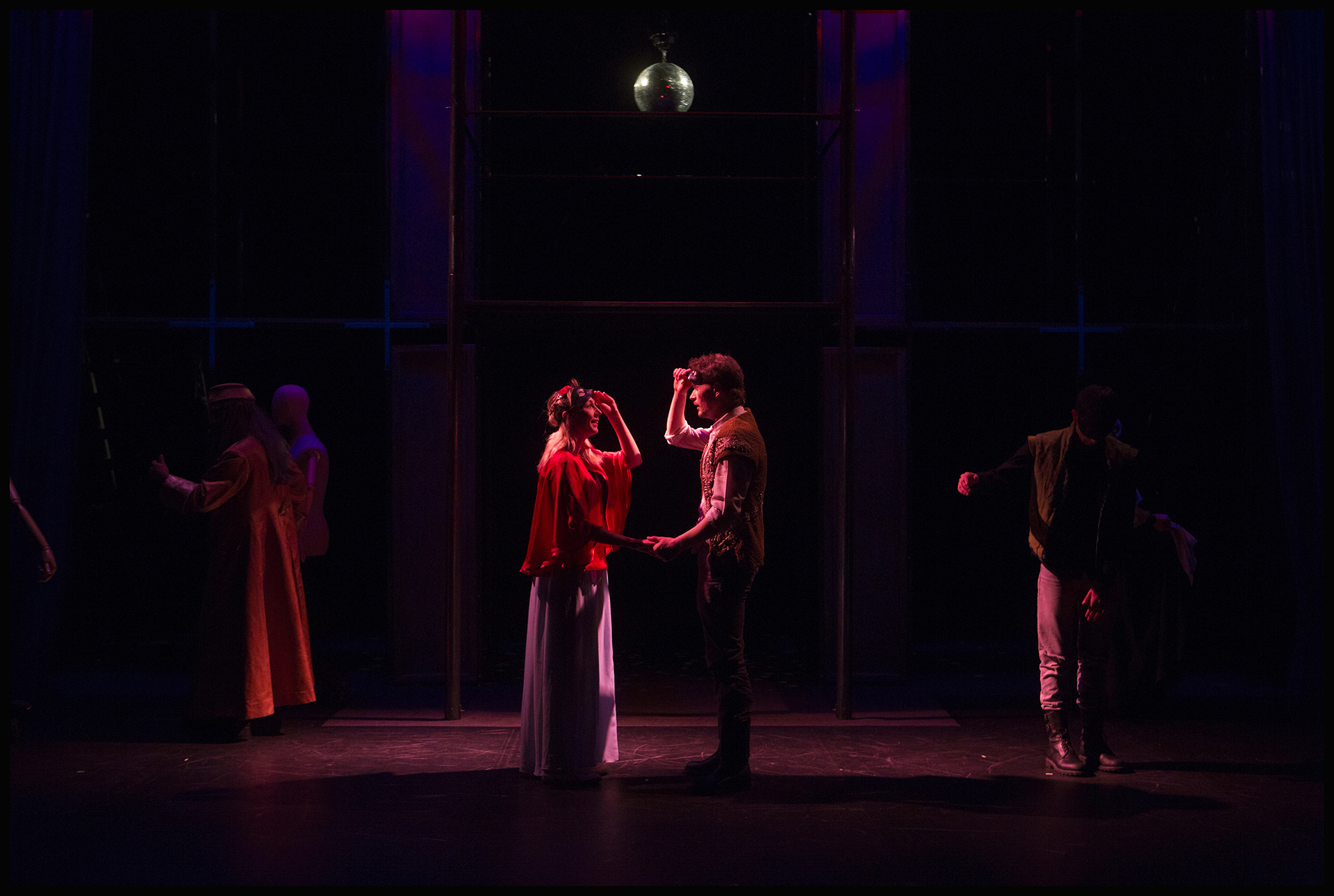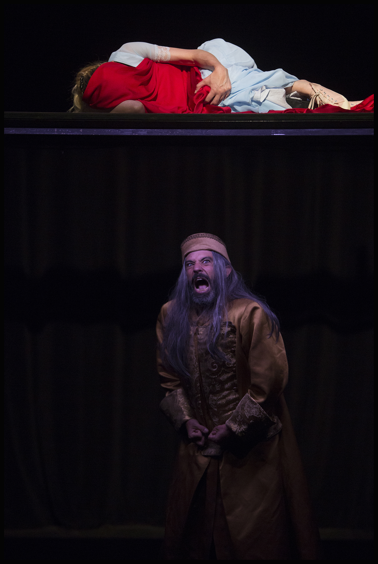 Une mise en scène qui joue sur la verticalité. Un dispositif scénique permettant de retrouver l'atmosphère du théâtre Elisabéthain dans nimporte quelle salle de spectacle. Un astucieuxsystème d'éclairage intégré au décor, qui assure une quasi autonomie au spectacle, et permet son adaptabilité dans presque tous types de lieux, à condtions de disposer d'une certaine hauteur.